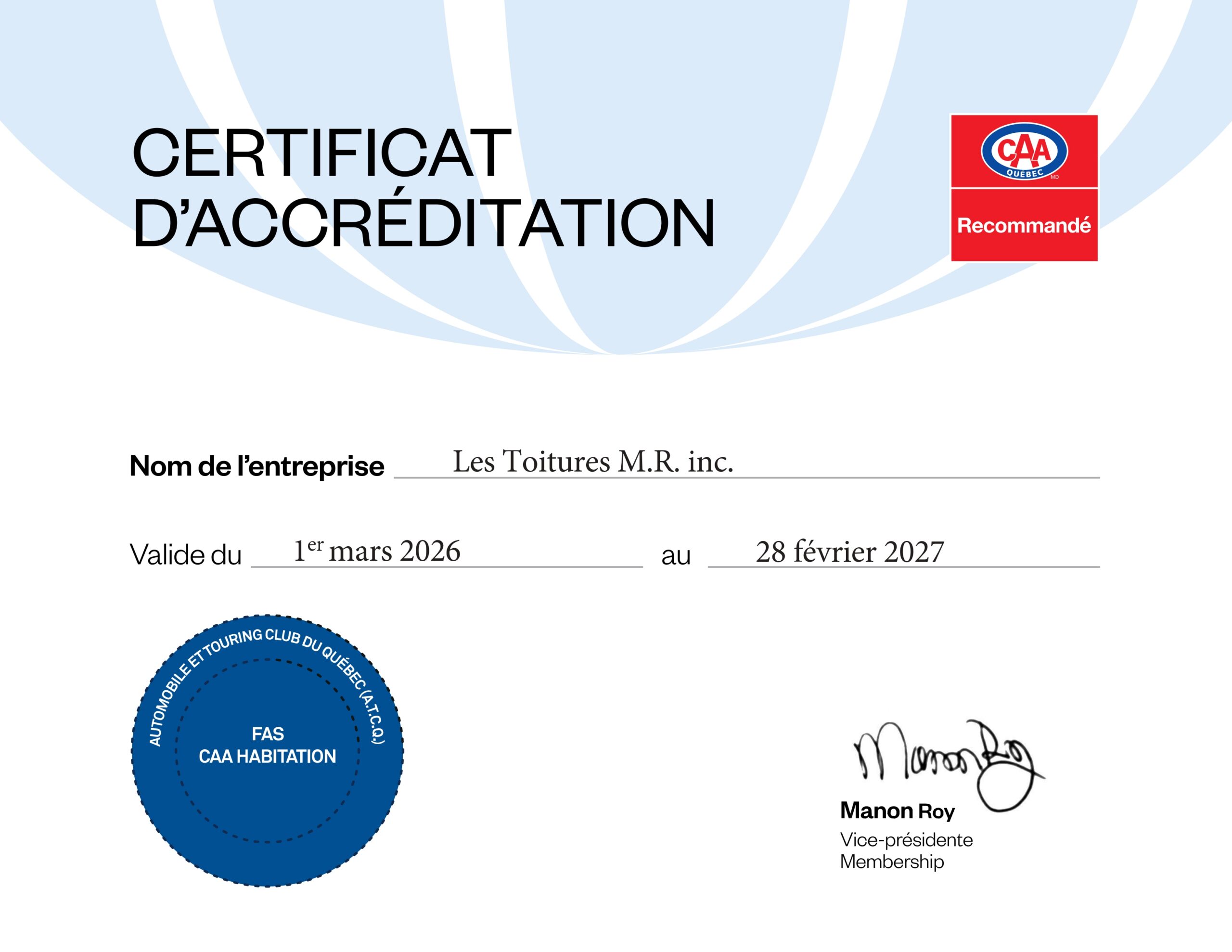 Notre entreprise, spécialisée en bardeaux d’asphalte, est Certifiée CAA-Québec– Partenaire et installateur de Building Products, détient une licence à la Régie du bâtiment de Québec – 5648-0320-01, et une entreprise recommandée en habitation de CAA-Québec, est Membre de la Commission de la construction du Québec, de la Commission de la santé et de la sécurité du travail et de l’Association des professionnels de la construction et de l’habitation du Québec.